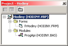 Projekt tvoří jeden formulář (pro hodiny jako takové, použit název souboru HODINY.FRM) a jeden modul s deklaracemi funkcí pro eliptické oříznutí formuláře, použit název souboru HODINY.BAS. Dále je zapotřebí mít k disposici rastrový obraz hodin, použit název souboru HODINY.BMP. Visual Basic udržuje informace o projektu v souboru, pro který byl použit název HODINY.VBP.