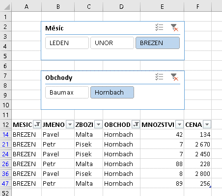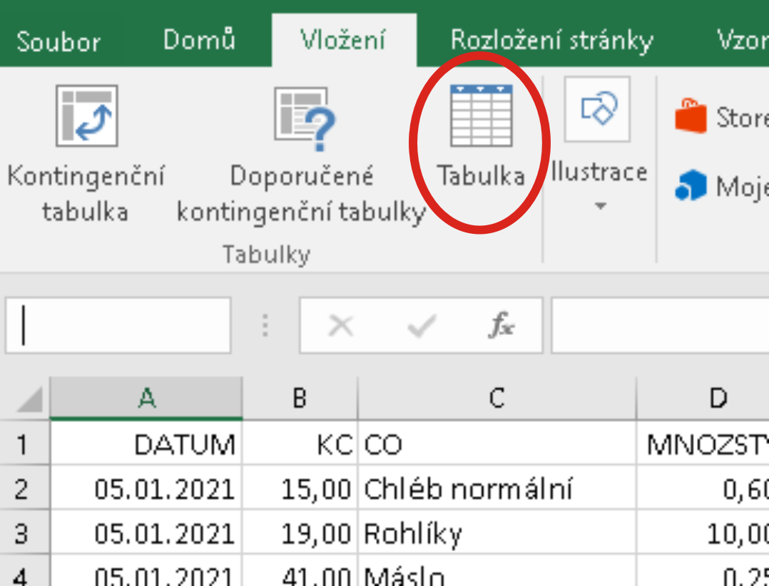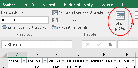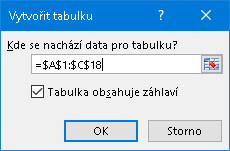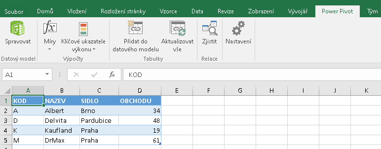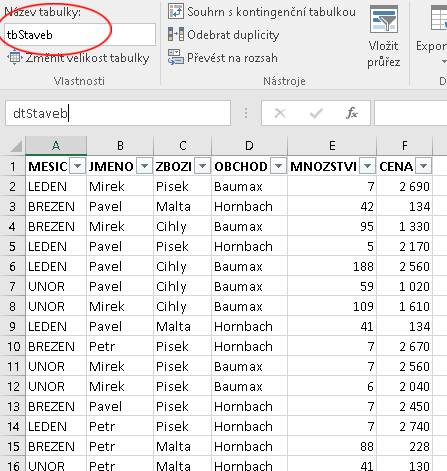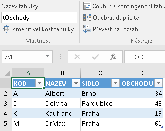 Nejprve tedy je třeba definovat oblast dat obchodů jako tabulku Excelu (nazvěme ji třeba tObchody):