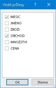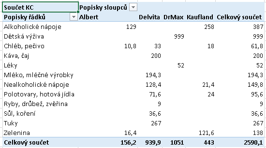 Řádkovým kritériem je tedy DRUH, sloupcovým je OBCHOD (obojí jsou kódy z tabulky VÝDAJE), součtovanou položkou jsou KČ (rovněž z tabulky VÝDAJE). Vytvoření takové tabulky zajistí běžně používaný známý postup.