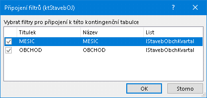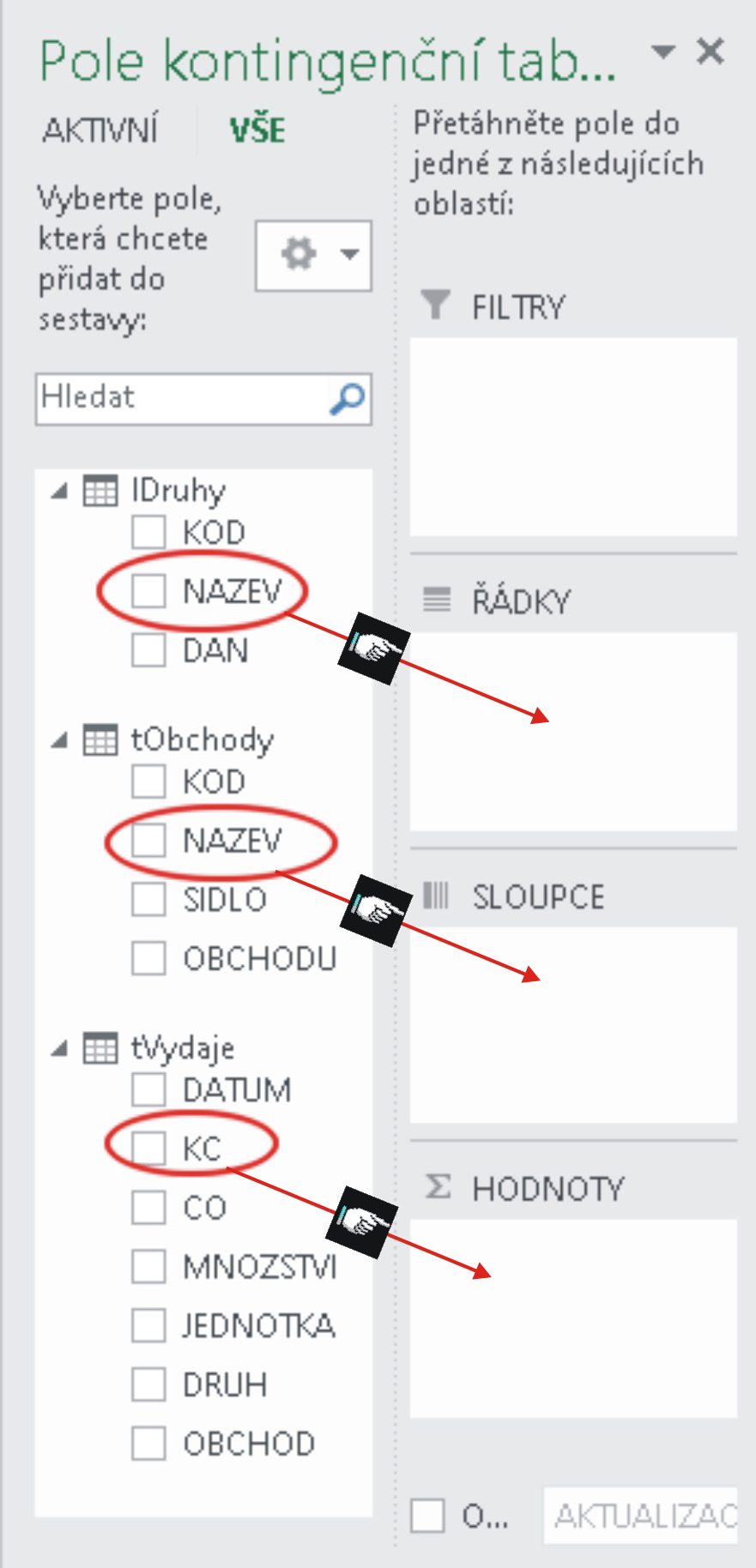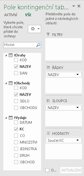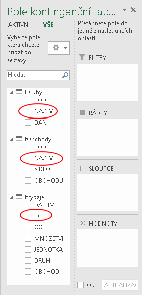 V panelu pro výběr polí kontingenční tabulky jsou v jeho levé části všechny dostupné datové zdroje datového modelu, u každého všechna jeho datová pole. Ta, která budou použita v ukázce, jsou zvýrazněna:
