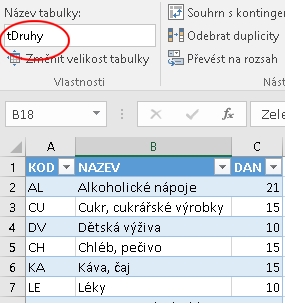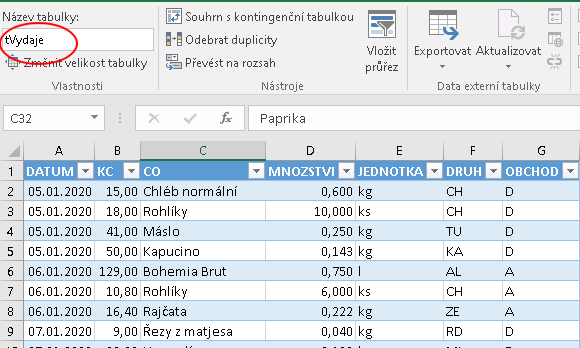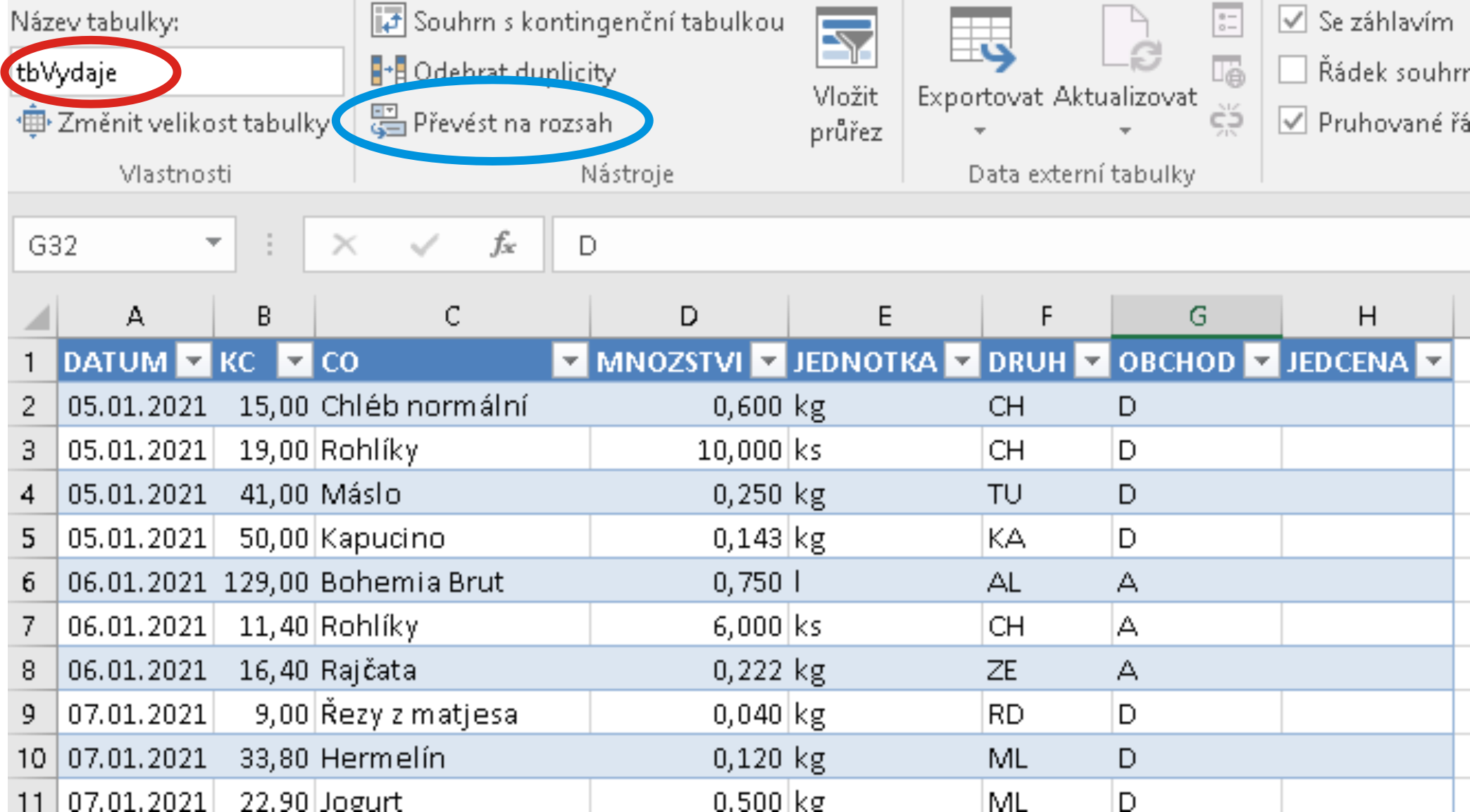 | tbVydaje [ [#Headers]; [KC] : [DRUH] ] | Pouze buňky záhlaví sloupců KC až DRUH | B1 : F1 |