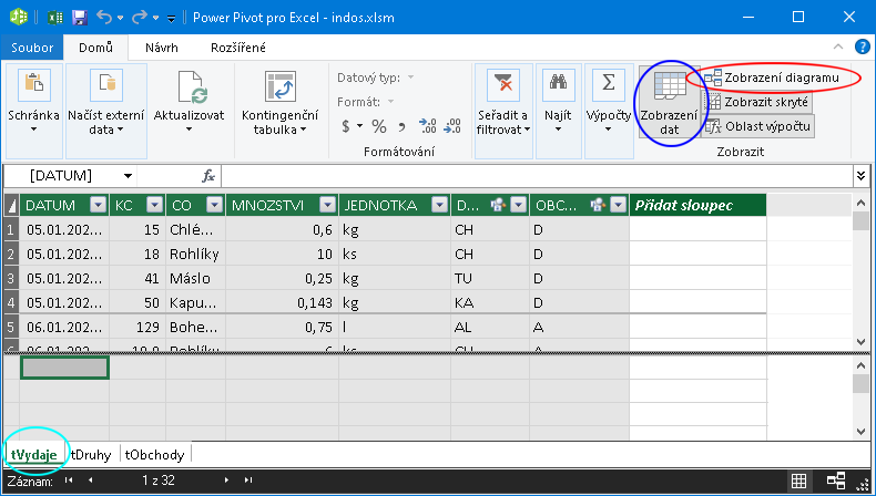 Na hlavní kartě Domů doplňku PowerPivot je vpravo skupina příkazů Zobrazit (viz předchozí obrázek). Prostředí PowerPivot zobrazuje při aktivní kartě Domů buď data, nebo diagram. Mezi těmito dvěma zobrazeními se přepíná příkazy Zobrazení dat (modře zakroužkované) a Zobrazení diagramu (červeně zakroužkované). Při aktivním zobrazení dat se zobrazí vždy data jednoho datového zdroje; záložkami vlevo dole se určuje, kterého (azurové zakroužkování).