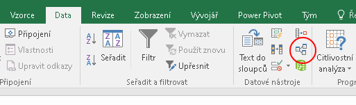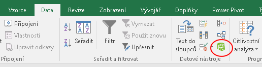 Poznámka: Text "Spravovat datový model" u shora zakroužkovaného příkazu se zobrazí jen při dostatečné šířce obrazovky (přesněji aktivního okna). Nápověda (tool-tip) k tomuto tlačítku bývá "Přejít do okna Power Pivot".