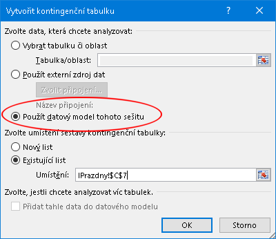 Pokud jsme autory dat my sami, je nám význam kódu druhu ZE nebo kódu obchodu K důvěrně známý. Pokud však takovou tabulku předložíme někomu jinému, bude mírně řečeno zmaten. Jeho zmatek evidentně vyřeší náhrada kódů v záhlavích řádků a sloupců plnými texty. Tyto plné texty jsou však v jiných oblastech sešitu, přičemž dřívější verze Excelu umožňovaly jako zdroj dat buď jedinou oblast, nebo externí zdroj dat. Ona jediná oblast v sešitu mohla (a pořád může) být i výsledkem databázového dotazu, pro onen externí zdroj dat musí být předem definováno připojení. Obojí je podle mínění autora tohoto textu nad schopnosti běžného uživatele. V popisované verzi Excelu je však nabízena třetí možnost, tou je definovaný datový model. Příklad jeho definice včetně vytvoření vazeb mezi třemi datovými zdroji je obsahem předchozích odstavců, a tento datový model bude použit.