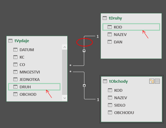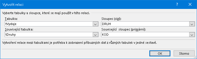 Demonstrovaný příklad požaduje vytvořit vazbu z tabulky námi nazvané tVýdaje vycházející ze sloupce DRUH (viz schéma nahoře) do související tabulky tDruhy směřující na sloupec KÓD: