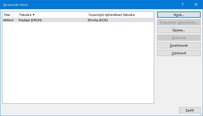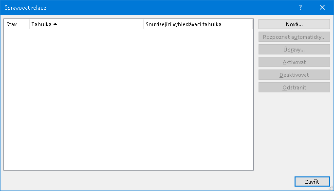 následkem čehož se otevře formulář Spravovat relace pro vytvoření, změn a odstranění konkrétní relace (může jich být samozřejmě více podle povahy úlohy). Zde evidentně požadujeme vytvořit relaci novou: