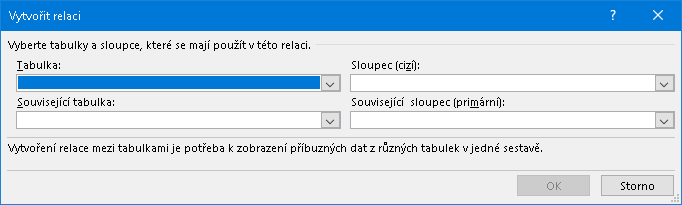 Následuje vlastní definování logického vztahu (relationship, relace) mezi dvěma datovými zdroji, zde tabulkami Excelu. Zajistí to aktivace příkazu Relace posloupností