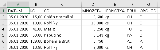 Zatímco údaj o nakoupeném zboží (chléb žitný, chléb vesnický, mléko plnotučné, mléko kefírové z Olešnice, mléko kefírové z ValMezu) je zde evidentně uveden jako otevřený text, údaj o druhu zboží se může skládat z hodně dlouhého označení a tedy druh jako otevřený text jistě nebude mnohokrát stejně zapisován přímo do výdajů (problém tzv. redundantních údajů), ale na jediném místě v jiné tabulce. Dalším podstatnou skutečností je vztah druhu zboží a sazby DPH, kterou je konkrétní druh zdaňován (článek je psán v březnu 2021; čtenář se v roce 2023 nebude stačit divit):