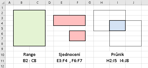 Poznámka: Pro jednu spojitou obdélníkovou oblast jsme ponechali objektový název „Range“, chápaný jako „Oblast variace mezi horní mezí (= levým horním rohem) a dolní mezí (=pravým dolním rohem) na konkrétní matici“. Těžko se totiž hledá odpovídající český termín, který by nekolidoval se stejným termínem, ale v jiném významu.