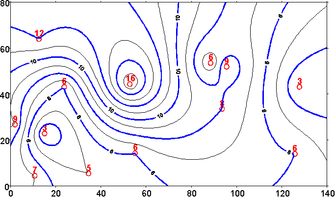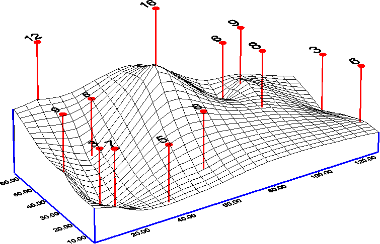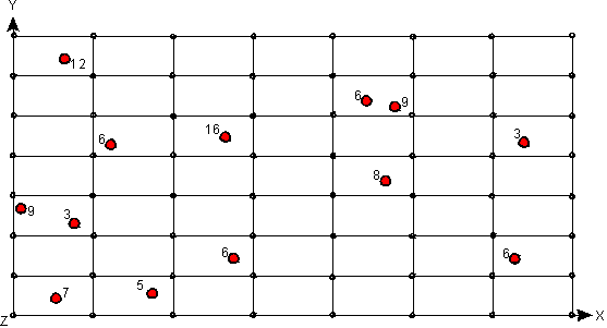 Je dáno (např. tabulkově) několik bodů [xi,yi,zi] - na obrázku jsou plnými body znázorněny jejich půdorysy [xi,yi], hodnoty zi jsou připsány ke každému z bodů. Oblast našeho zájmu pokryjeme obdélníkovou sítí (na obrázku 8 linek rovnoběžných s osou x, 8 linek rovnoběžných s osou y). Průsečík jedné vodorovné a jedné svislé linky nazvěme uzel. Sítí je tedy dána soustava uzlů (v našem případě 8x8=64 uzlů, na obrázku jsou zvýrazněny malými kroužky).
