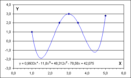 Jejím řešením jsou hodnoty koeficientů [a4, ... ,a0] polynomické funkce stupně 4, která je uvedena v následujícím grafu. Tamtéž je však patrný zásadní důvod praktické nepoužitelnosti tohoto postupu pro zjišťování pravděpodobných hodnot v “neznámých” místech: pokud data vyjadřují např. experimentálně zjištěné hodnoty délkové roztažnosti (Y) v závislosti na teplotě (X), pak záporná hodnota pro x=1.5 nebo x=4.5 je vysoce nepravděpodobná!