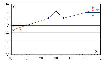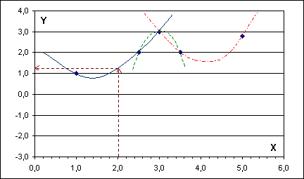 Proveďme výpočet pro x0 = 1,6 tak, jak je to naznačeno na hořejším obrázku. Je x0 = 1,6 Î <1; 2,5>. Nejprve odhadněme y0 řešením dvou rovnic pro koeficienty přímky a dosazením do její rovnice. Je