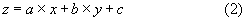 přičemž oba tvary jsou zcela ekvivalentní. První se používá ponejvíce pro vyjádření závislosti zkoumané veličiny y na dvou nezávisle působících veličinách x1 a x2, druhý spíše pro prostorovou veličinu z závislou na poloze v "základní" rovině [x,y]. Při odvozování vztahů pro výpočet odhadů parametrů a, b, c bude použito symboliky ze vztahu (2).