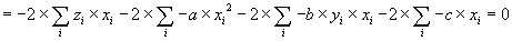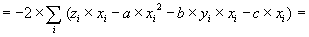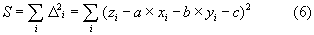 Protože body [xi,yi,zi] jsou dány "napevno" pomocí (3), ovlivňují hodnotu S pouze koeficienty a, b, c. Jest tedy nalézti takové hodnoty těchto koeficientů, pro které je