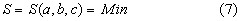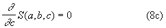 Tuto podmínku - jak známo z úlohy o extrémech funkcí - splňují ty hodnoty a, b, c, pro něž (kromě jiných podmínek) má funkce S lichou derivaci nulovou. Hledáme tedy řešení a, b, c soustavy rovnic