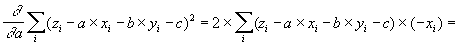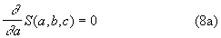 Protože S (a,b,c) je dáno vztahem (6), protože derivace součtu (S) je součet derivací a protože derivace složené funkce (zde (...)2) je rovna "derivace vnější x derivace vnitřní", je pro (8a)