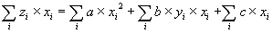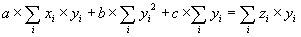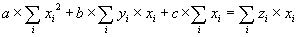 Protože součet 1 v poslední rovnici je roven počtu zadaných trojic [xi,yi,zi] (který označme n), lze přepsat tři poslední rovnice do maticového tvaru