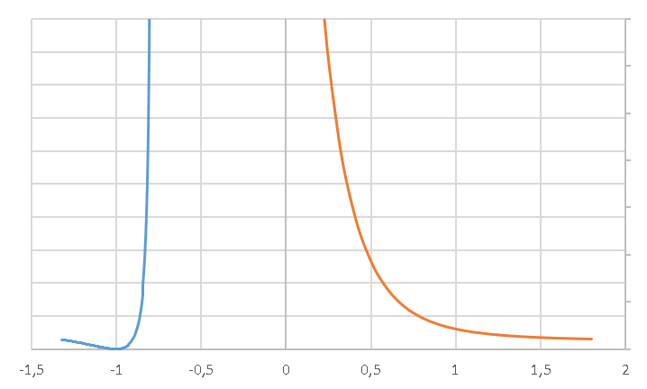 Graf takové funkce (např. pro a=1, b=2) je následující (funkce není definována v intervalu (-³√(a/b); 0), v jehož krajních hodnotách má svislé asymptoty, vodorovnou asymptotu má v y=ln b):