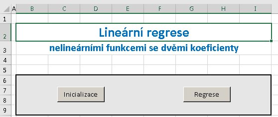 Poznámka: Tlačítko Inicializace inicializuje proměnné programu, odstraní ze sešitu všechny listy kromě prvního, a pak znovu přidá (nyní už prázdné) čtyři listy pro výsledky. Tyto inicializační akce se provedou automaticky také bezprostředně po otevření sešitu. Následuje-li tedy hned po otevření sešitu požadavek na výpočet regresí, není nutno v tomto okamžiku tlačítko Inicializace použít.
