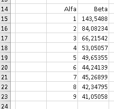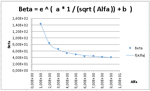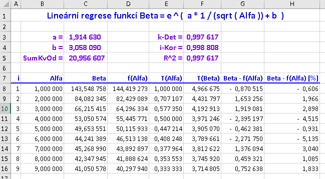 Poznámka k hořejší ukázce: Testovací data veličiny Beta jsou funkčními hodnotami funkce y = e2/√x + 3 náhodně změněné o ±5%. To zároveň alespoň částečně testuje program i metodu, protože koeficienty a resp. b by měly být blízko hodnotám 2 resp. 3.