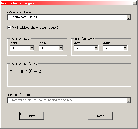 Program posléze provede vždy jako svou první výpočetní činnost regresi jednou konkrétní funkcí - a to takovou, kterou uživatel definuje rozvíjecími seznamy Transformace X resp. Y: