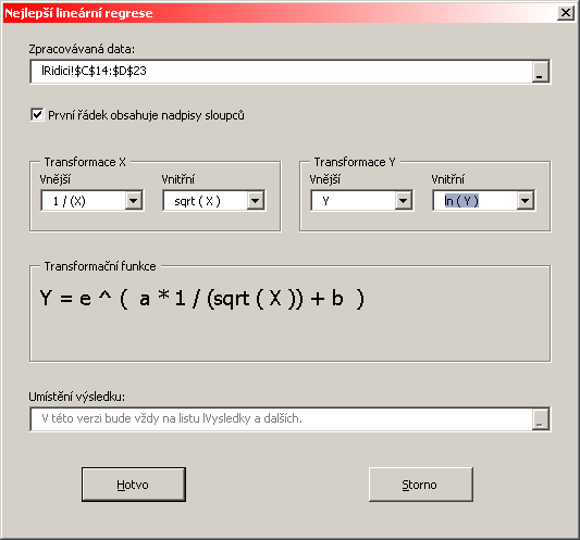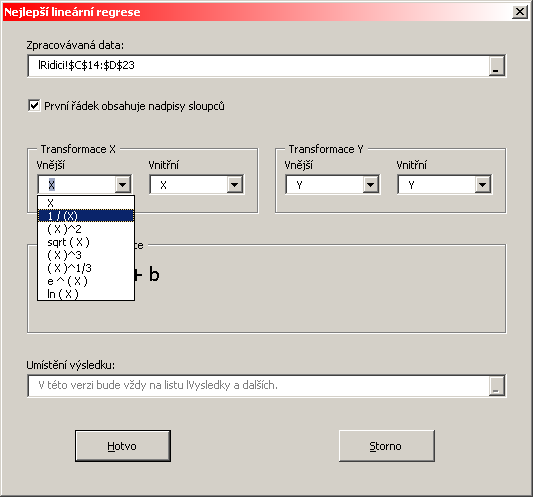 Při postupném výběru dílčích transformačních funkcí se průběžně zobrazuje tvar modelované funkce ve tvaru y=f(x). Není to sice obvyklý matematický zápis, ale protože jde o lineární zápis rovnice běžně používaný ve formulích Excelu, měl by být pro běžné uživatele srozumitelný.
