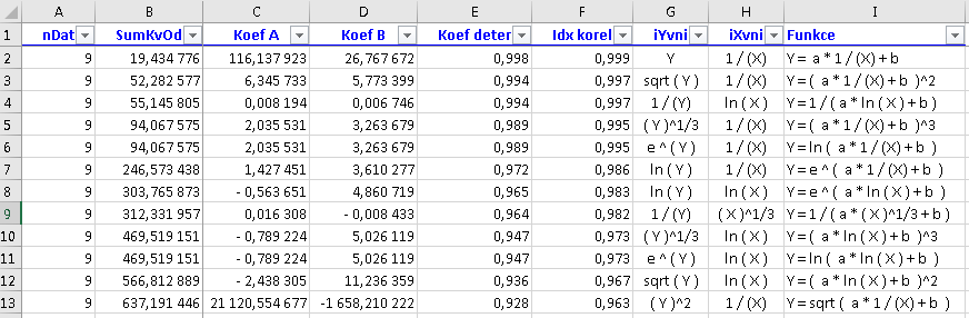 Poslední list s výstupy lJednoduché reflektuje právě uvedený komentář. V mnoha situacích totiž odborník hledající závislost mezi svými dvěma veličinami na počátku zvolí vztahy co jednodušší. Proto v posledním listu výsledků jsou uvedeny funkce ne se dvěma transformacemi každé ze dvou veličin, ale jen s jednou: