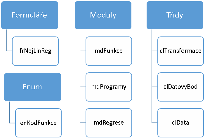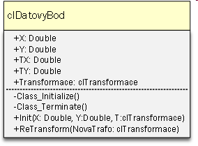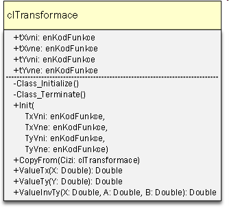 Na nejnižší hierarchické úrovni je pak objektová třída clTransformace, jejíž veřejná datová pole uchovávají informaci o všech čtyřech transformačních funkcích.